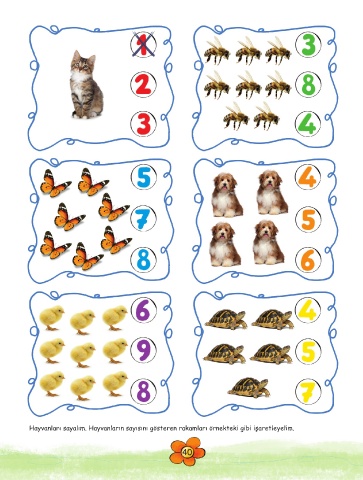 Hayvanları sayalım. Hayvanların sayısını gösteren rakamları örnekteki gibi işaretleyelim. 40