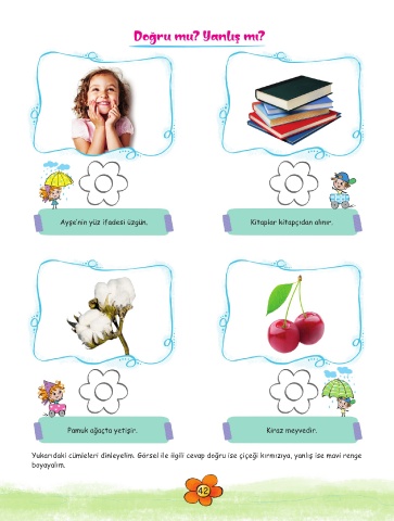 Ayşe’nin yüz ifadesi üzgün. Kitaplar kitapçıdan alınır. Pamuk ağaçta yetişir. Kiraz meyvedir. Yukarıdaki cümleleri dinleyelim. Görsel ile ilgili cevap doğru ise çiçeği kırmızıya, yanlış ise mavi renge boyayalım. 42