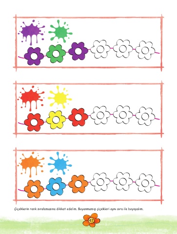 Çiçeklerin renk sıralamasına dikkat edelim. Boyanmamış çiçekleri aynı sıra ile boyayalım. 47