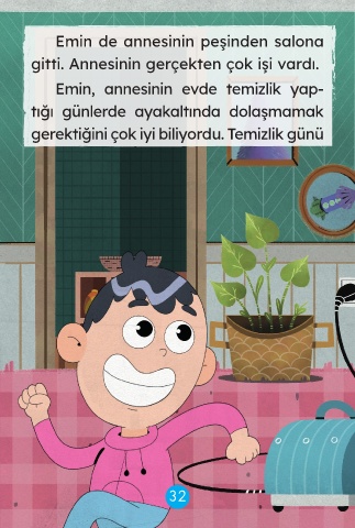 Emin de annesinin peşinden salona gitti. Annesinin gerçekten çok işi vardı. Emin, annesinin evde temizlik yap- tığı günlerde ayakaltında dolaşmamak gerektiğini çok iyi biliyordu. Temizlik günü 32