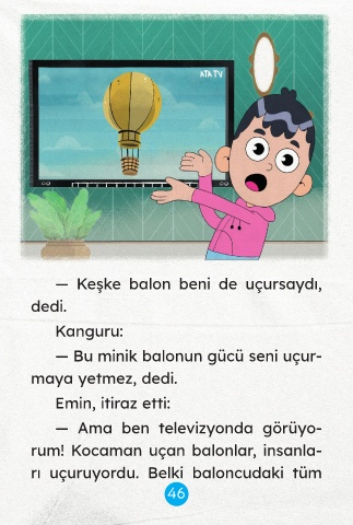 — Keşke balon beni de uçursaydı, dedi. Kanguru: — Bu minik balonun gücü seni uçur- maya yetmez, dedi. Emin, itiraz etti: — Ama ben televizyonda görüyo- rum! Kocaman uçan balonlar, insanla- rı uçuruyordu. Belki baloncudaki tüm 46