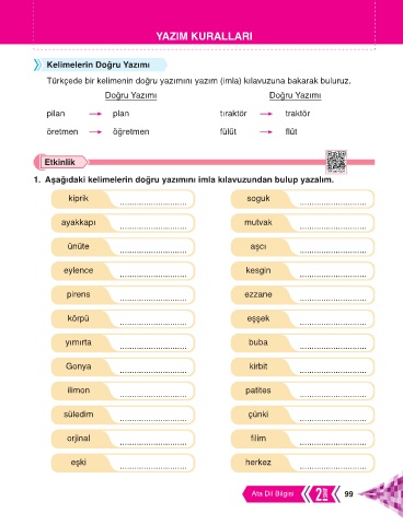 1. Aşağıdaki kelimelerin doğru yazımını imla kılavuzundan bulup yazalım.