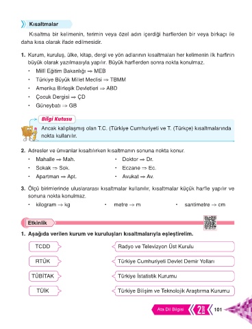 1. Kurum, kuruluş, ülke, kitap, dergi ve yön adlarının kısaltmaları her kelimenin ilk harfinin