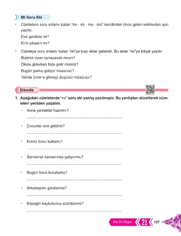 1. Aşağıdaki cümlelerde “mi” soru eki yanlış yazılmıştır. Bu yanlışları düzelterek cüm-
