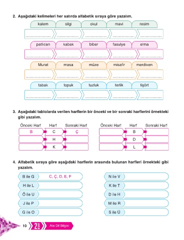 2. Aşağıdaki kelimeleri her satırda alfabetik sıraya göre yazalım.