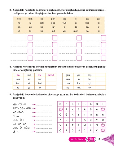 5. Aşağıdaki hecelerle kelimeler oluşturup yazalım. Bu kelimeleri bulmacada bulup