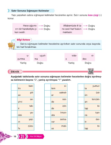 Aşağıdaki tablolarda satır sonuna sığmayan kelimeler hecelerine doğru ayrılmış-