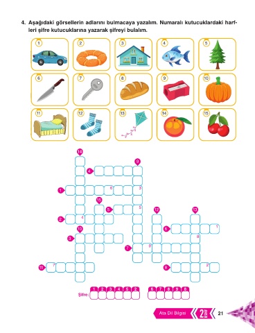 4. Aşağıdaki görsellerin adlarını bulmacaya yazalım. Numaralı kutucuklardaki harf-