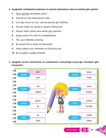 4. Aşağıdaki cümlelerde kulanılan zıt anlamlı kelimelerin altını örnekteki gibi çizelim.