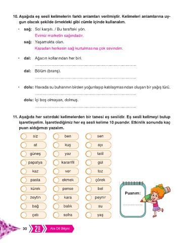işaretleyelim. İşaretlediğimiz her eş sesli kelime 10 puandır. Etkinlik sonunda kaç