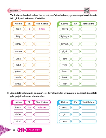 1. Tabloda verilen kelimelere “-cı, -lı, -lık, -sız” eklerinden uygun olanı getirerek örnek-