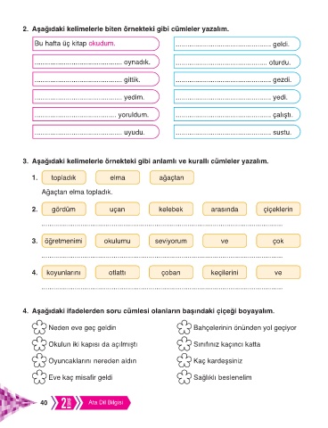 2. Aşağıdaki kelimelerle biten örnekteki gibi cümleler yazalım.