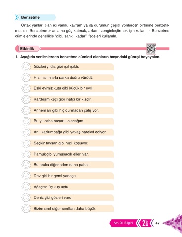 1. Aşağıda verilenlerden benzetme cümlesi olanların başındaki güneşi boyayalım.
