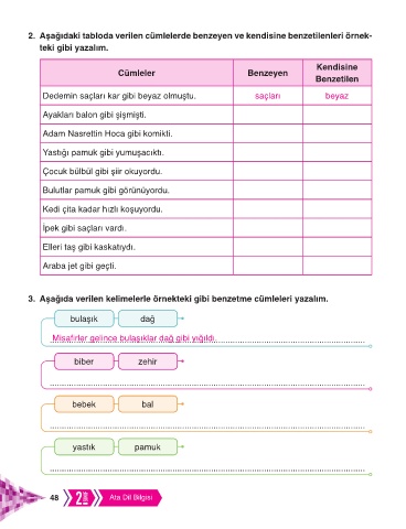 2. Aşağıdaki tabloda verilen cümlelerde benzeyen ve kendisine benzetilenleri örnek-
