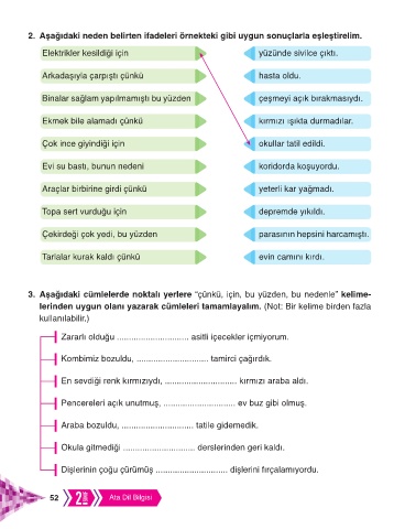 2. Aşağıdaki neden belirten ifadeleri örnekteki gibi uygun sonuçlarla eşleştirelim.
