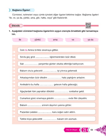 1. Aşağıdaki cümleleri bağlama ögelerinin uygun olanıyla örnekteki gibi tamamlaya-