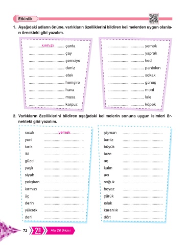 2. Varlıkların özelliklerini bildiren aşağıdaki kelimelerin sonuna uygun isimleri ör-