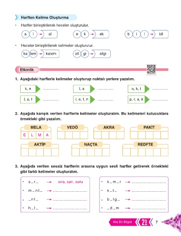 1. Aşağıdaki harflerle kelimeler oluşturup noktalı yerlere yazalım.