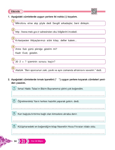 1. Aşağıdaki cümlelerde uygun yerlere iki nokta (:) koyalım.