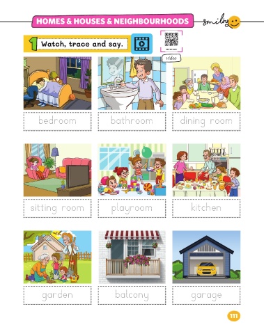 HOMES & HOUSES & NEIGHBOURHOODS 1 1 Watch, trace and say. video bedroom bathroom dining room sitting room playroom kitchen garden balcony garage 111