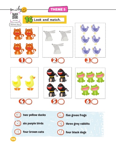 THEME 5 14 Look and match. 14 answer key 1 1 2 2 3 3 4 4 5 5 6 6 a a two yellow ducks d d five green frogs b b six purple birds e e three grey rabbits c c four brown cats f f four black dogs 126