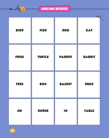 SMILING WORDS BIRD FISH DOG CAT FROG TURTLE PARROT RABBIT TREE BOX BASKET DUCK ON UNDER IN TABLE 134