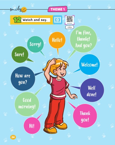 THEME 1 12 12 Watch and say. video I’m fine, Hello! thanks! Sorry! And you? Sure! Welcome! How are you? Well done! Good morning! Thank you! Hi! 24
