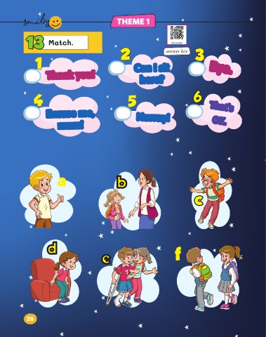 THEME 1 13 Match. answer key 13 1 1 2 2 Can I sit 3 3 Bye. Can I sit Bye. Thank you! Thank you! here? here? 4 4 5 5 6 6 That’s That’s Excuse me, Hurray! Excuse me, Hurray! OK. mum! mum! OK. a a b b c c d d e e f f 26