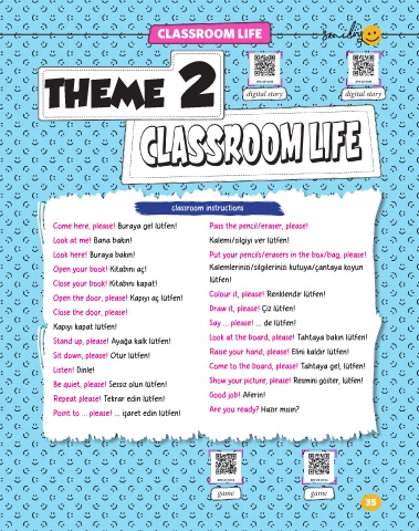 Open your book! Kitabını aç! Kalemlerinizi/silgilerinizi kutuya/çantaya koyun