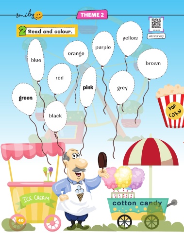 THEME 2 2 2 Read and colour. y ello w answer key yellow purple purple or ange orange blue blue b row n brown re d red pink pink grey r ey g gr een green black black 40