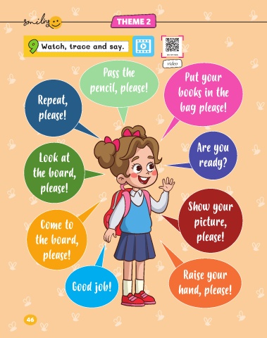 THEME 2 9 9 Watch, trace and say. video Pass the Put your pencil, please! books in the Repeat, bag please! please! Are you Look at ready? the board, please! Show your Come to picture, the board, please! please! Raise your Good job! hand, please! 46