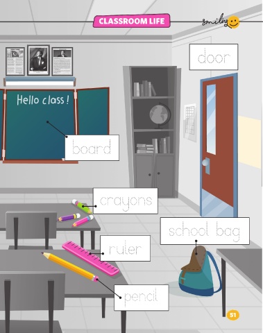 CLASSROOM LIFE door book window chair table board notebook crayons desk eraser school bag paper ruler pen scissors pencil 51
