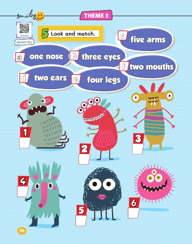 THEME 3 5 5 Look and match. c c five arms answer key five arms one nose three eyes a a one nose b b three eyes f f two mouths two mouths two ears d d two ears e e four legs four legs 1 1 3 3 2 2 4 4 6 6 5 5 70