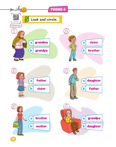 THEME 4 5 5 Look and circle. answer key 1 2 a grandma a sister b grandpa b brother 3 4 a father a daughter b sister b father 5 6 a brother a grandpa b mother b daughter 94