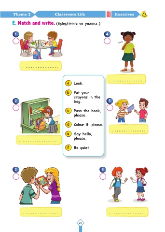 Theme 2 Classroom Life Exercises E. Match and write. (Eşleştiriniz ve yazınız.) 1 4 Shhh a Look. b Put your crayons in the 2 bag. 5 c Pass the book, please. d Colour it, please. e Say hello, please. f Be quiet. 3 6 26