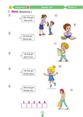 Exercises Family Life Theme 4 C. Match. (Eşleştiriniz.) 1 a She has got blue eyes. b 2 He has got blond hair. c 3 He has got short hair. d 4 He has got brown eyes. 5 She has got blonde hair. e 1 2 3 4 5 67
