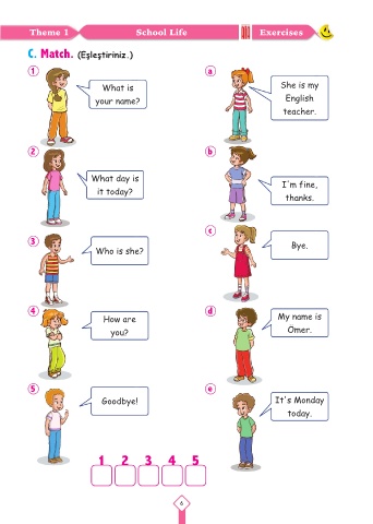 Theme 1 School Life Exercises C. Match. (Eşleştiriniz.) 1 a What is She is my your name? English teacher. 2 b What day is I'm fine, it today? thanks. c 3 Bye. Who is she? 4 d How are My name is you? Ömer. 5 e Goodbye! It's Monday today. 1 2 3 4 5 6