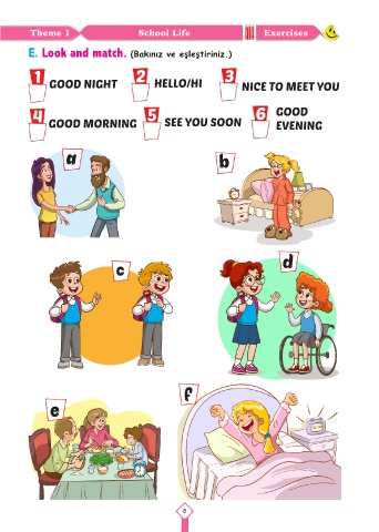 Theme 1 School Life Exercises E. Look and match. (Bakınız ve eşleştiriniz.) 1 GOOD NIGHT 2 HELLO/HI 3 NICE TO MEET YOU 4 GOOD MORNING 5 SEE YOU SOON 6 GOOD EVENING a b c d f e 8