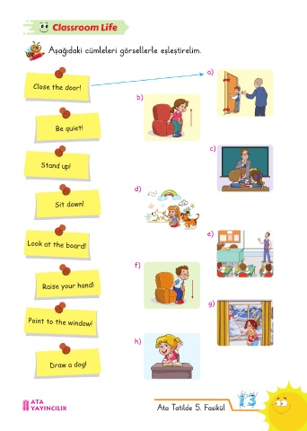 Classroom Life Aşağıdaki cümleleri görsellerle eşleştirelim. a) Close the door! b) Be quiet! c) Stand up! d) Sit down! e) Look at the board! f) Raise your hand! g) Point to the window! h) Draw a dog! Ata Tatilde 5. Fasikül