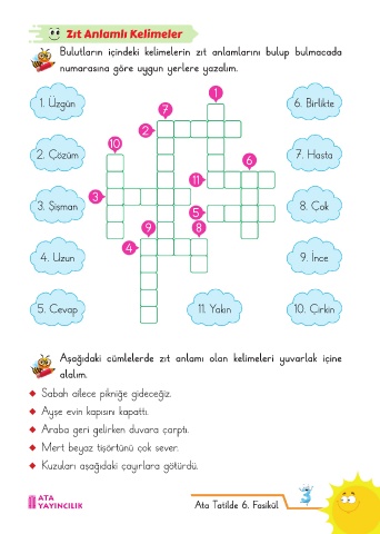 Bulutların içindeki kelimelerin zıt anlamlarını bulup bulmacada