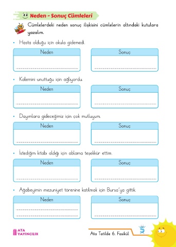 Cümlelerdeki neden sonuç ilişkisini cümlelerin altındaki kutulara