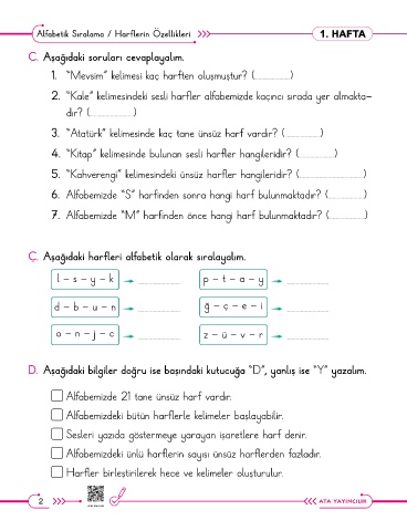 Ç. Aşağıdaki harfleri alfabetik olarak sıralayalım.