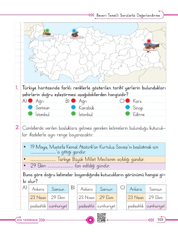 1. Türkiye haritasında farklı renklerle gösterilen tarihî yerlerin bulundukları
