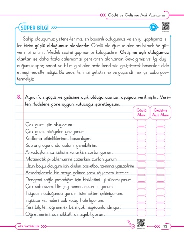 8. Aynur’un güçlü ve gelişime açık olduğu alanlar aşağıda verilmiştir. Veri-