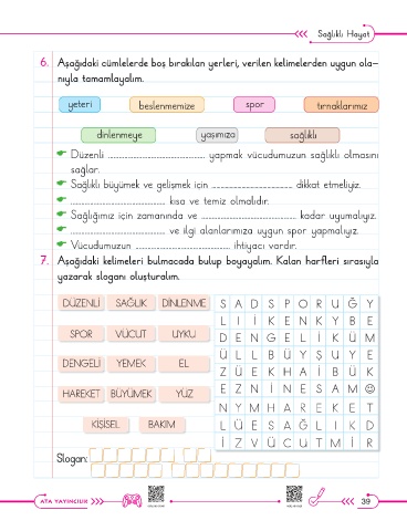 7. Aşağıdaki kelimeleri bulmacada bulup boyayalım. Kalan harfleri sırasıyla