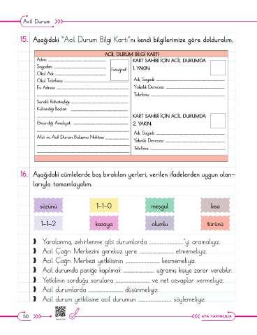 15. Aşağıdaki “Acil Durum Bilgi Kartı”nı kendi bilgilerimize göre dolduralım.