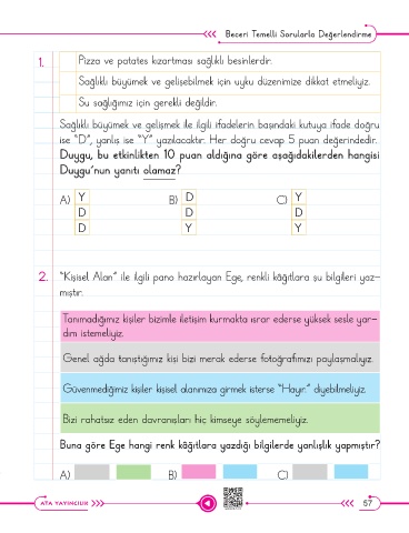ise “D”, yanlış ise “Y” yazılacaktır. Her doğru cevap 5 puan değerindedir.