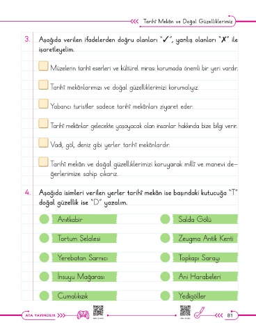 4. Aşağıda isimleri verilen yerler tarihî mekân ise başındaki kutucuğa “T”