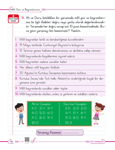 16. Ali ve Duru, katıldıkları bir yarışmada millî gün ve bayramları-