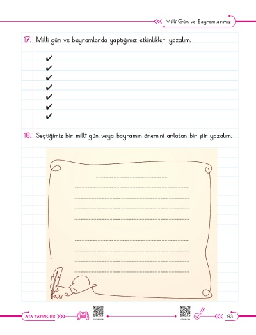 Millî Gün ve Bayramlarımız 17. Millî gün ve bayramlarda yaptığımız etkinlikleri yazalım. ✔ ✔ ✔ ✔ ✔ ✔ ✔ 18. Seçtiğimiz bir millî gün veya bayramın önemini anlatan bir şiir yazalım. 93